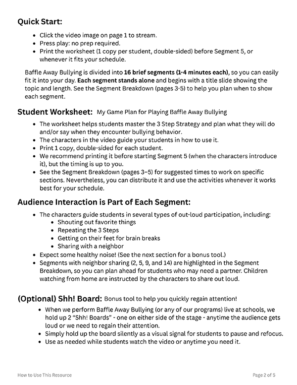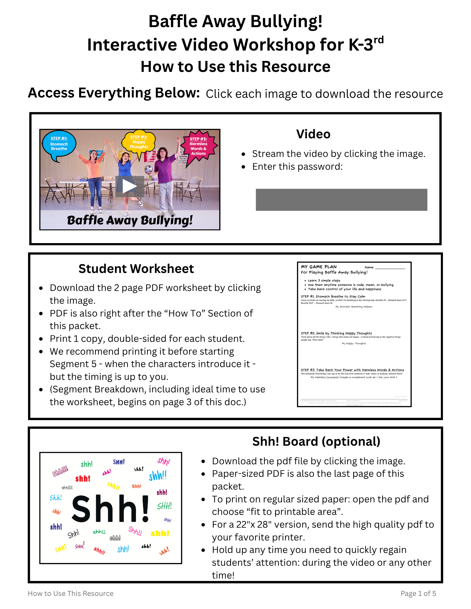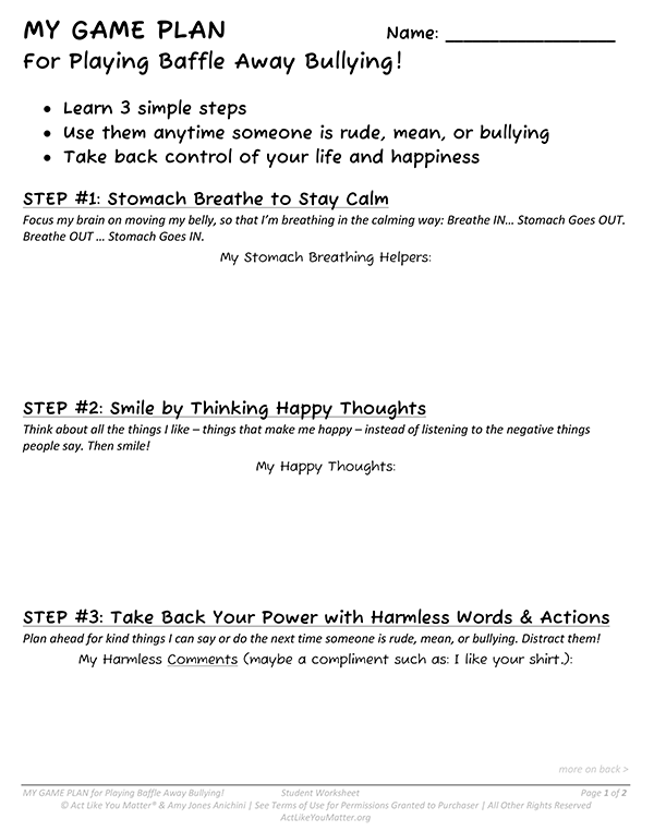 (2) Printable Student Worksheet PDF: “My Game Plan for Playing Baffle Away Bullying”: